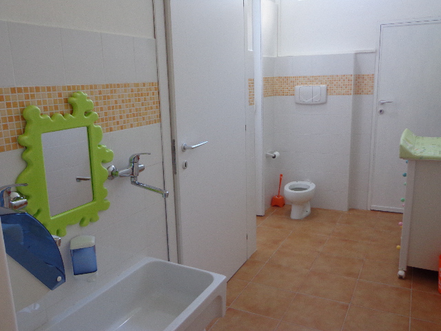 Un ampio e luminoso bagno dotato di lavandini ad altezza bimbo, wc di diverse misure e fasciatoio per il cambio dei più piccini.